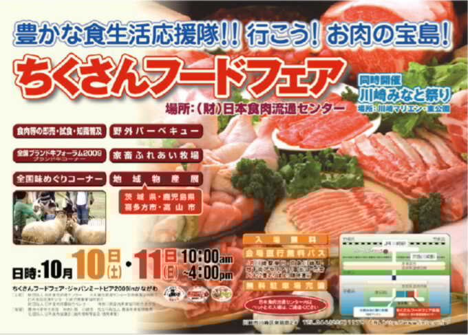今年は景気低迷の下、「豊かな食生活応援隊!! 行こう!お肉の宝島!」をキャッチフレーズに、また同時に開催されます「全国ブランド牛フォーラム2009(会場川崎駅前)」ともタイアップし、食肉消費に向けてのキャンペーンを強化します。 また、会場内では高級ブランド牛肉から手頃な食肉加工品まで多種多様な商品を揃えるほか、全国各地の特産品などを一同に集めたコーナーや、親子で楽しめるコーナーなど、多彩な催しを行います。 さらに、今年も地元「川崎みなと祭り」との連携を図り、フェアのさらなる充実を図っています。