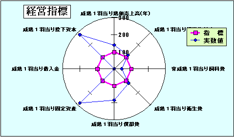 各項目指標値に近い数値を示しているが、単位労働時間当たり日産卵量が低くい。これは、販売に費やす時間が長いためと考えられる。破卵率が、へい死廃棄率が低く、経営に寄与している。