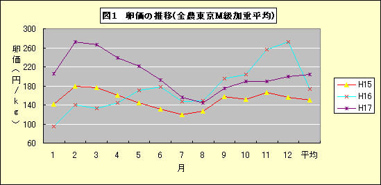 新聞相場は平成17年1月〜12月の全農M級加重平均が204.4円で、この卵価はここ五年間で見られない高値の卵価であった。1月当初から平均で200円台の相場となり2月、3月は250円を超える卵価を示した。夏場は150円前後の相場となったが、後半持ち直し、久々に年間平均で200円を超す相場となった。