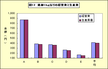 鶏卵1kgの経営費(自家労賃は含まない)と経営費から副産物収入(鶏ふん及び廃鶏等の売却収入)を差し引いて求めた生産原価の関係を図12に示した。平均では経営費が412.2円、生産原価が404.3円となり、その差は7.9円であった。