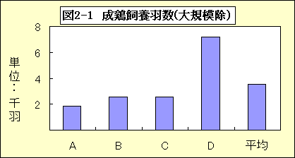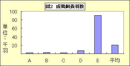 対象農家の経営規模を平均飼養羽数で示すと、図2のとおりであり、2千羽台から約10万羽台であった。成鶏舎の形式は、開放鶏舎1戸、小型ウインドウレス鶏舎3戸、大型ウインドウレス鶏舎1戸であった。