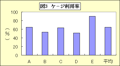 対象経営のケ−ジ利用率は図3に示したとおり、最高は90.1%、最低は51.5%、平均で64.7%となっており、指標値(86〜88%)を超える経営は1戸であった。かつてはスケールメリットを追求して規模拡大を進めていたが、中小規模の養鶏経営は、直販による有利な販売戦略に切り替えたため、適正飼養羽数に抑え、1羽当たりの鶏卵売上を高めて経営を安定させる傾向が強く、これが利用率を低くしている要因である。