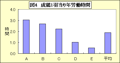成鶏1羽当りの年間労働時間を図4に示した。最高は1羽当り3.06時間、最低は0.51時間で、その平均値は1.90時間となっているが、中小規模は大規模の2〜6倍程度の多い労働時間となっている。また、前年に比べて中小規模はやゝ労働時間が長くなっている。