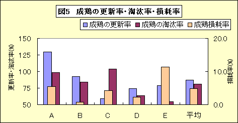 成鶏の更新率、淘汰率を図5に示した。両数値とも養鶏場間の差が大きく、この要因として、強制換羽の実施状況や淘汰方式の差によるものもあるが、鳥インフルエンザの影響で経営に対する不安に拠り、導入時期、回数の乱れによるものもある。