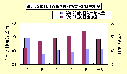 成鶏1日1羽当りの飼料消費量は図6に示すとおりで、消費量の最低は94.9g、最高は118.2gと、約24gの差の開きがあり、全体平均では103.0gとなったが、1農場を除いて指標値(110〜113g)より少ない消費量にとどまった。これには、最近の育種改良が飼料消費量の低減にシフトされており、その効果が現れているものと考えられる。