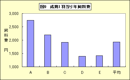 これらの関係を成鶏1羽当り年間飼料費として整理すると、図9のように自家販売比率の高い小規模経営ほど高く、規模が大きく原料卵として農協や問屋の出荷が多い経営ほど安くなっている。